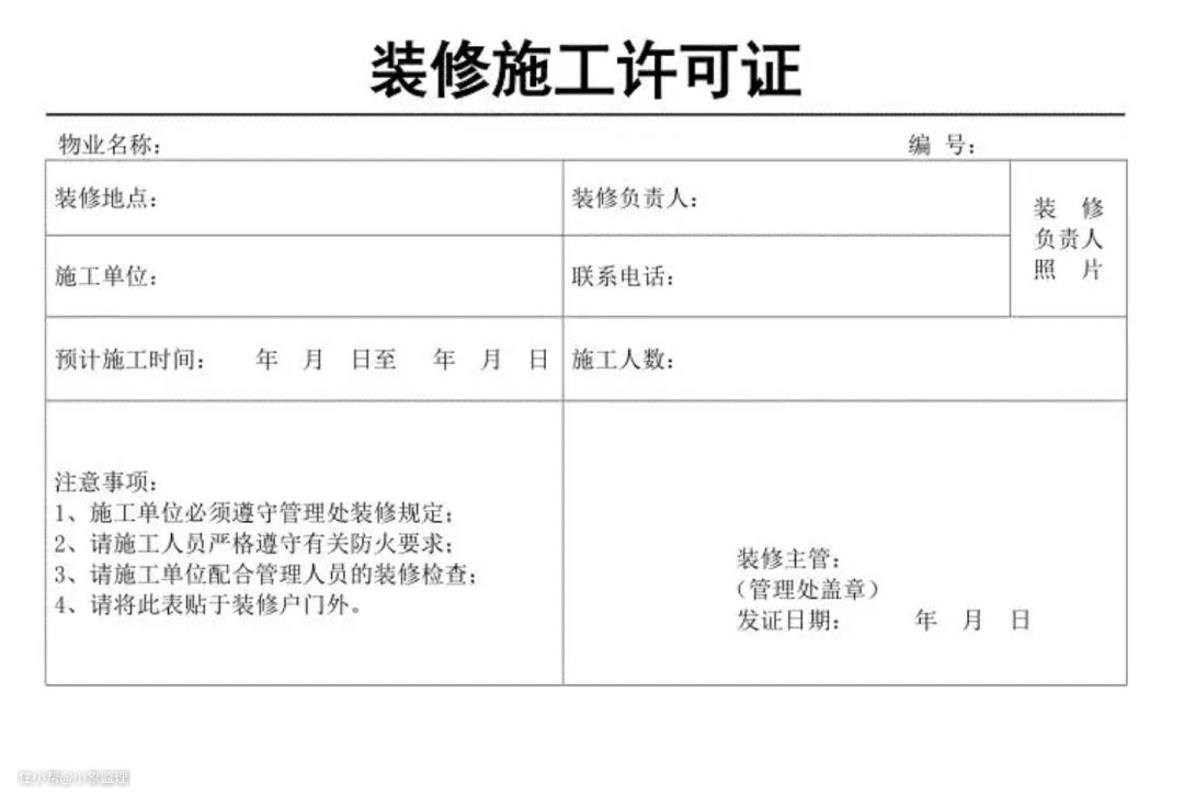 实际开工前,需要装修人员、业主共同去物业办理施工许可证。