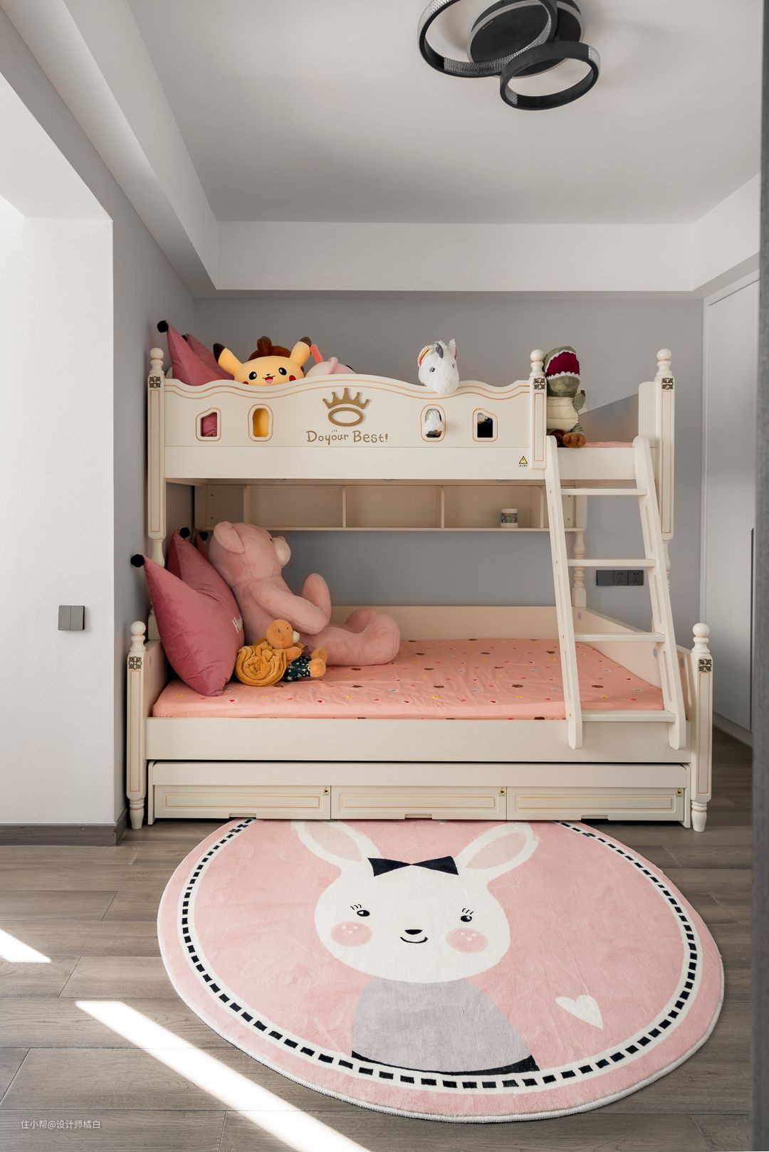 柔和娇嫩的粉色装点、可爱十足的玩偶点缀,轻松打造出了孩子心中充满幸福感的奇幻浪漫梦境。