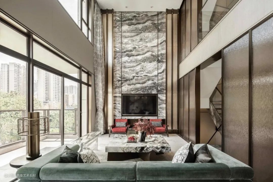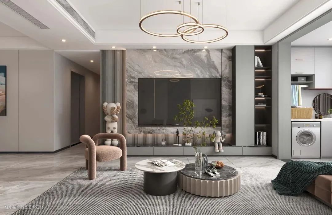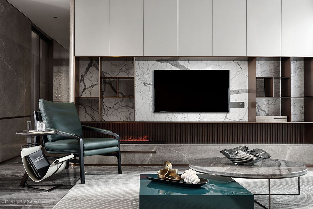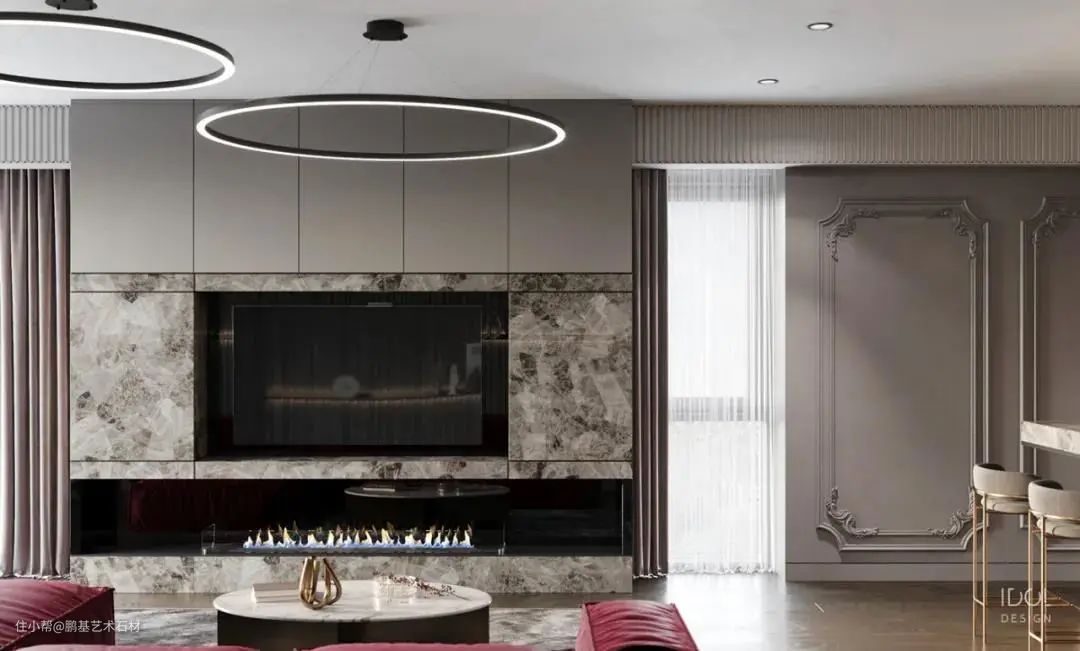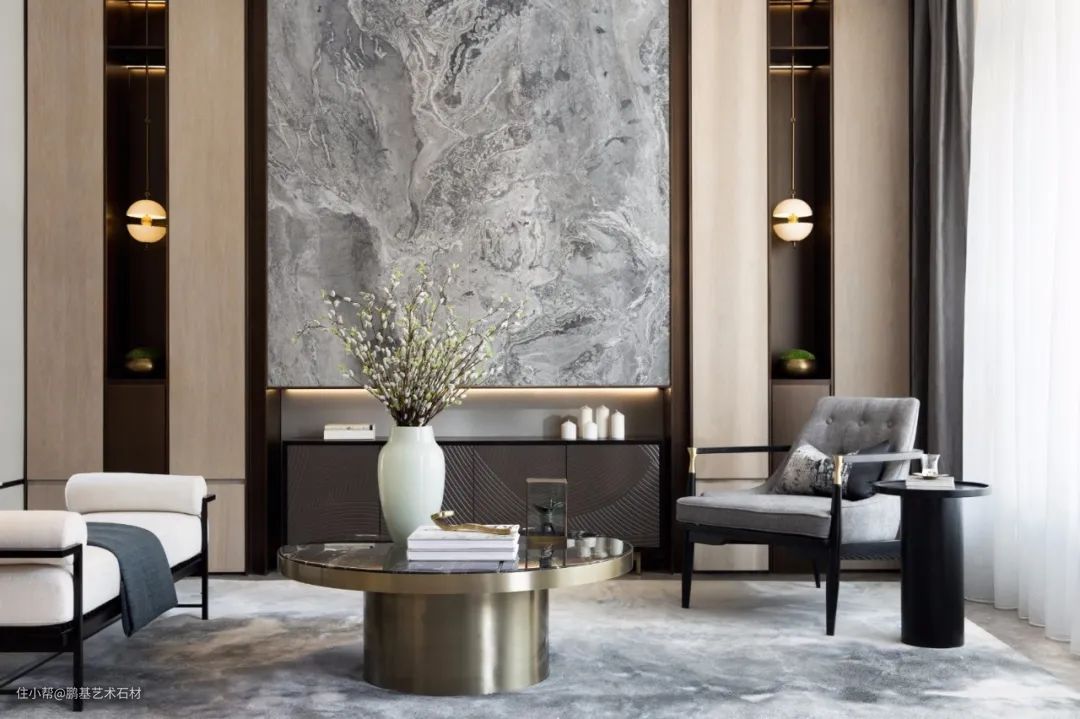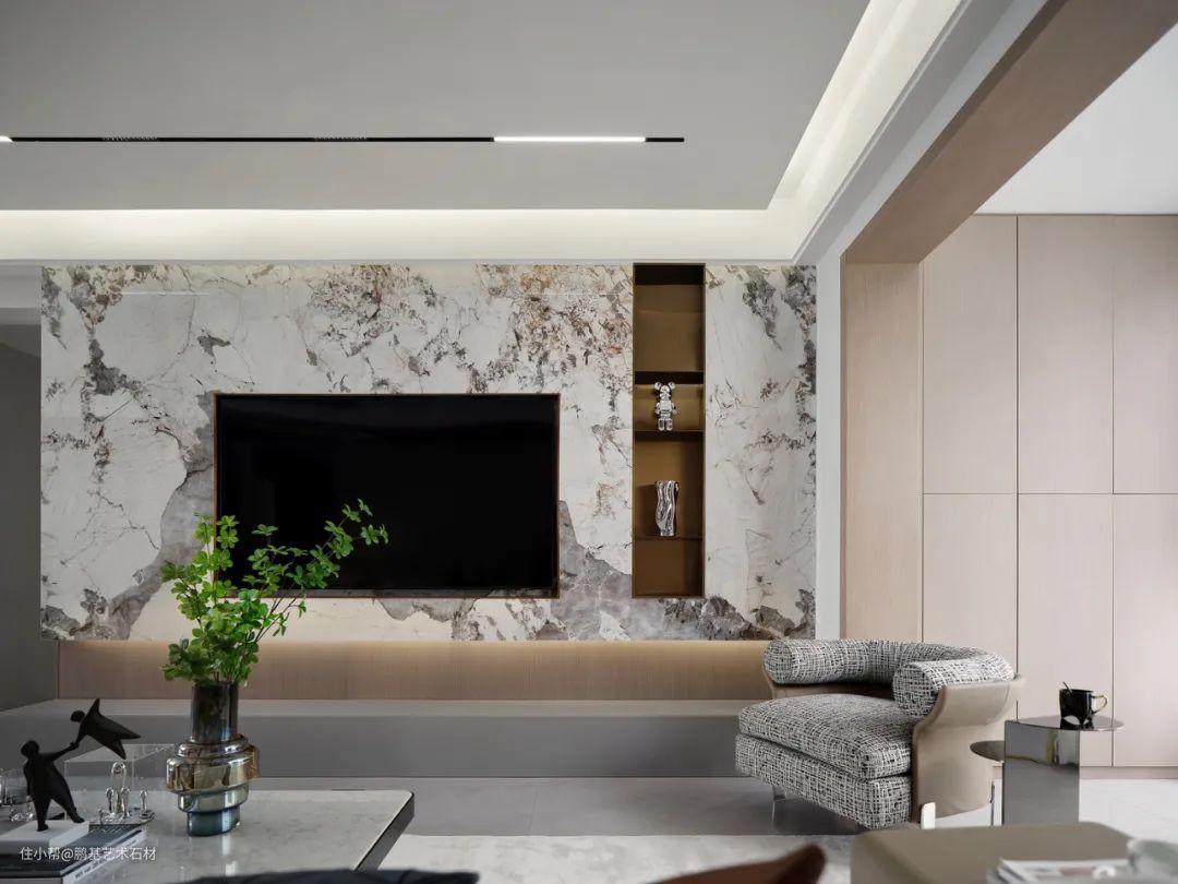 客厅的电视背景墙是一进家门最吸睛的地方,一定要做的高端大气上档次、低调奢华有内涵,当然还得实用!不管是现代风、奶油风、欧式风、中式风、侘寂风,石材电视墙是比较常用的设计元素。而且石材背景墙防火、防潮、防噪音,而且方便清洁!