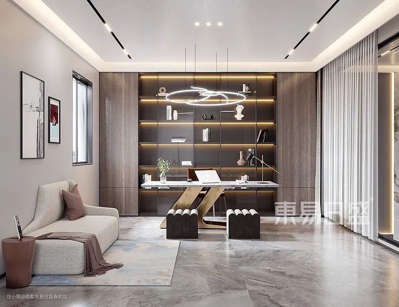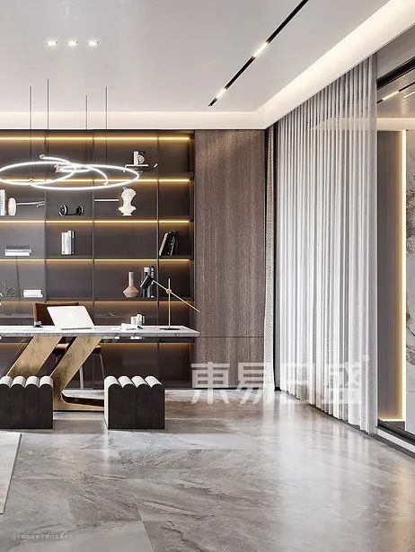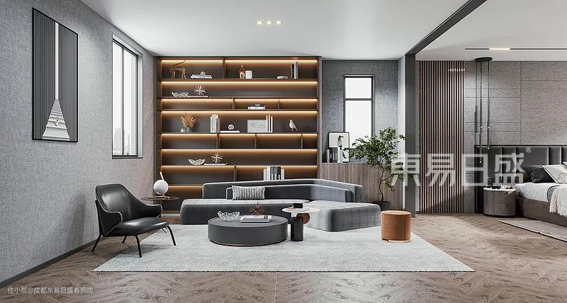 本案空间以金属、皮革的中性色调为主,用色彩的纯度传递细腻的质感。