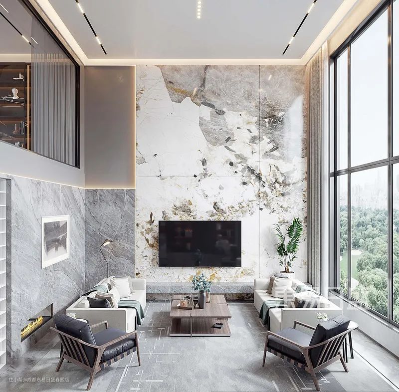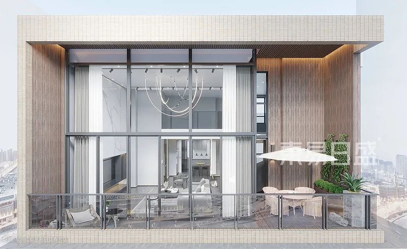 落地窗作为衔接,将室内挑空客厅与室外超大露台联结,四季不同的城市美景一览无余,美轮美奂的无敌视野成为稀松平常。夹层设置休闲区与书房,无论是会客洽谈还是独自思考,都能在绝对安静私密的空间内进行。