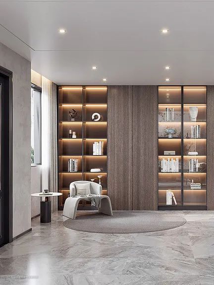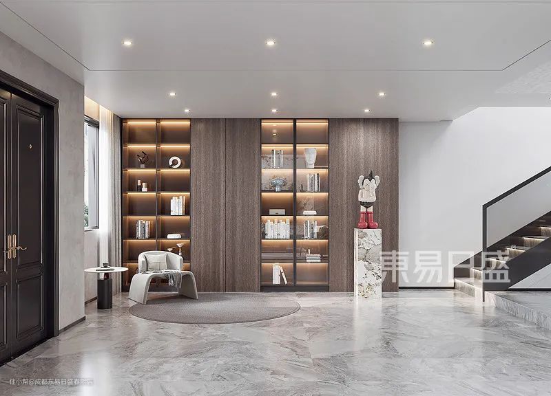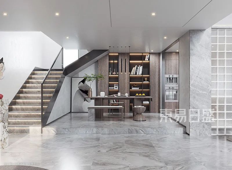 豪宅的中转空间也不能草草了事。一阶一灯的楼梯带来如梦似幻的使用效果,黑白色系经典搭配,洁净有序,高级时尚。一侧读书区,一侧茶室的设置提升空间利用率,同时方便从家庭设置来告诉小孩子,阅读是一件自然而然、随时发生、无比美好的事情。