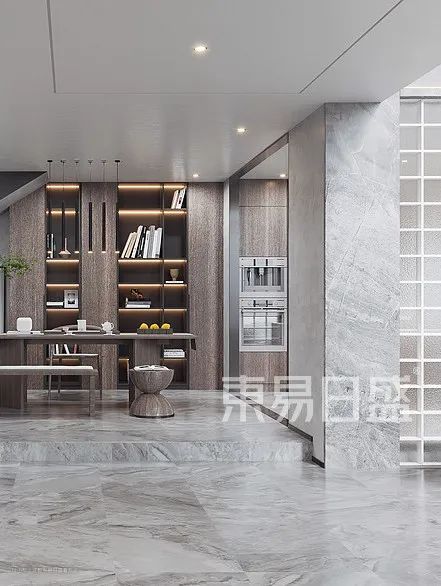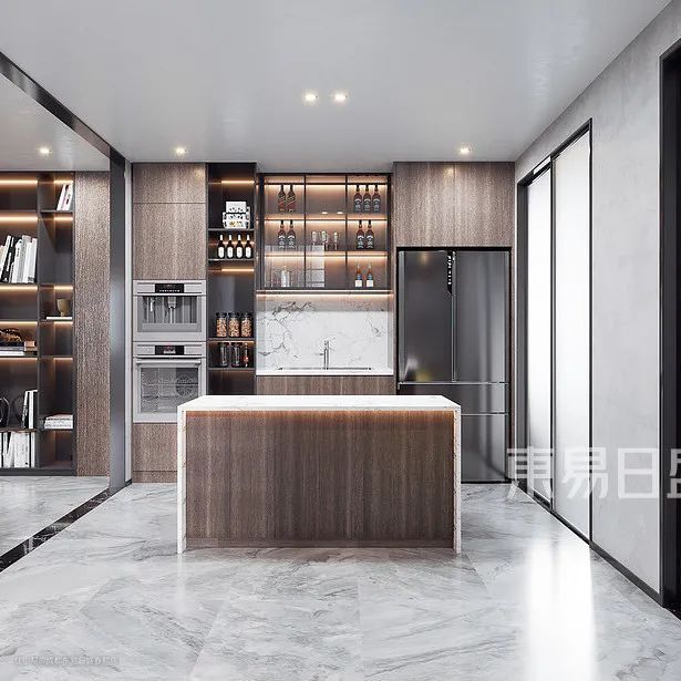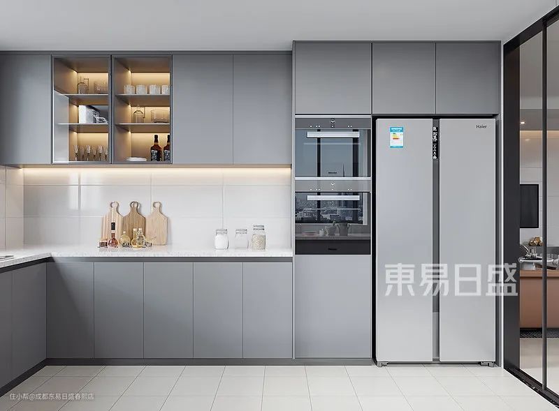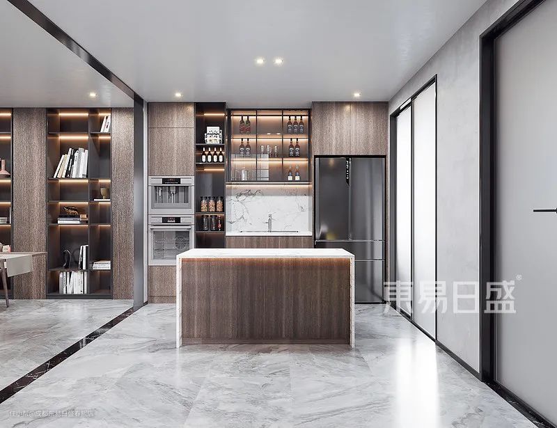 餐厨区域衔接自然,以玻璃为隔断,既保障了空间的采光,又提升了家庭成员之间的互动,还可以把油烟隔绝在厨房区域,加之智能家居贯穿,有效的提升了生活的舒适度。