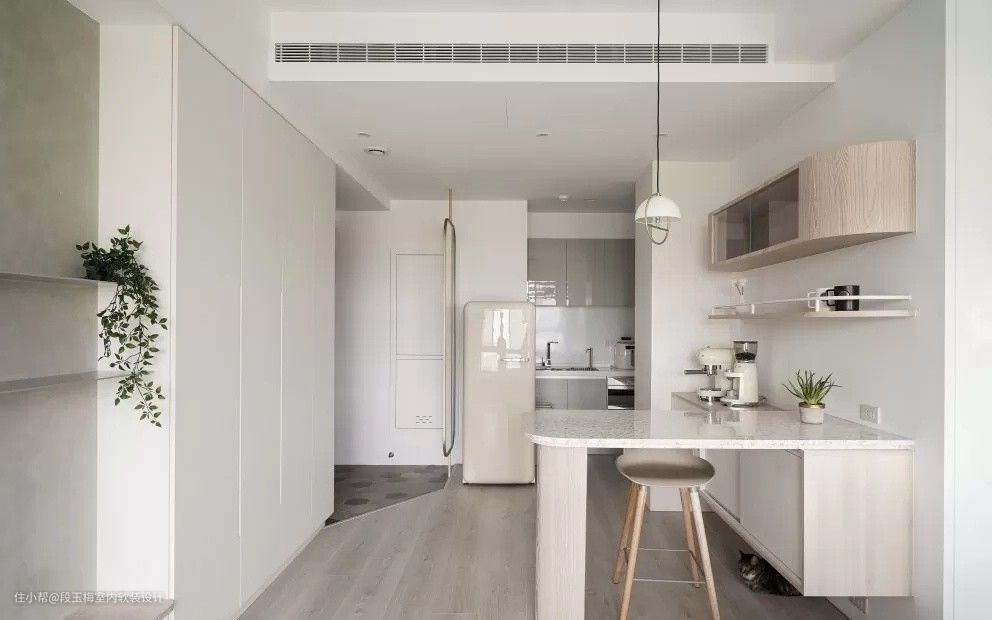 开放式厨房,灰色质感的收纳柜,搭配白色墙面,简约又高级。米白色的冰箱和整体家的氛围特别搭,放在外面也能使厨房空间变得宽敞。