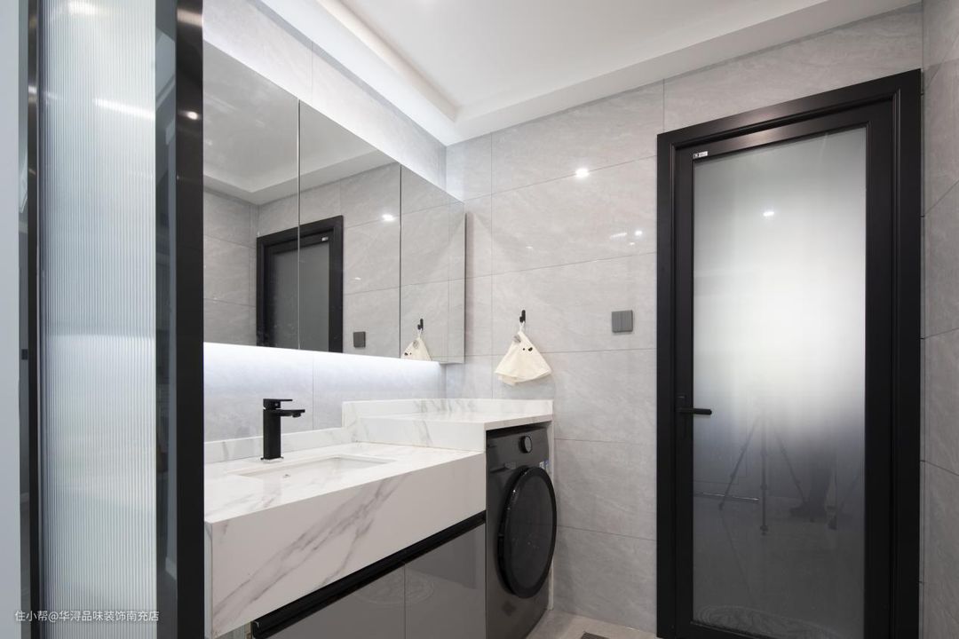 公共卫生间采用干湿分离的设计,把淋浴区和洗漱区分开,实现功能两分区,而墙面和地面都铺上了防滑高级瓷砖,很好地避免了藏污纳垢,平时打扫卫生也很简便很轻松,超清大尺寸化妆镜搭配LED镜前灯,灯光提亮了整个空间,用高级大理石打造台下洗手盆,架空设计储物柜和洗衣区,增加收纳的同时,又合理利用了空间。