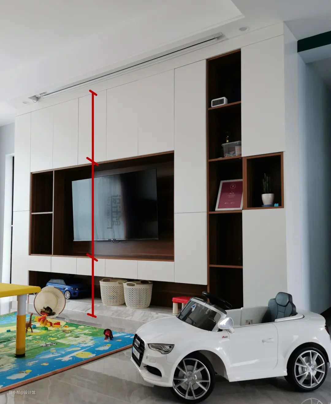 如果不打算用扫地机器人的话,也可以在整个定制电视柜底部装个地台,这样拖地时里面的收纳篮不容易弄脏。