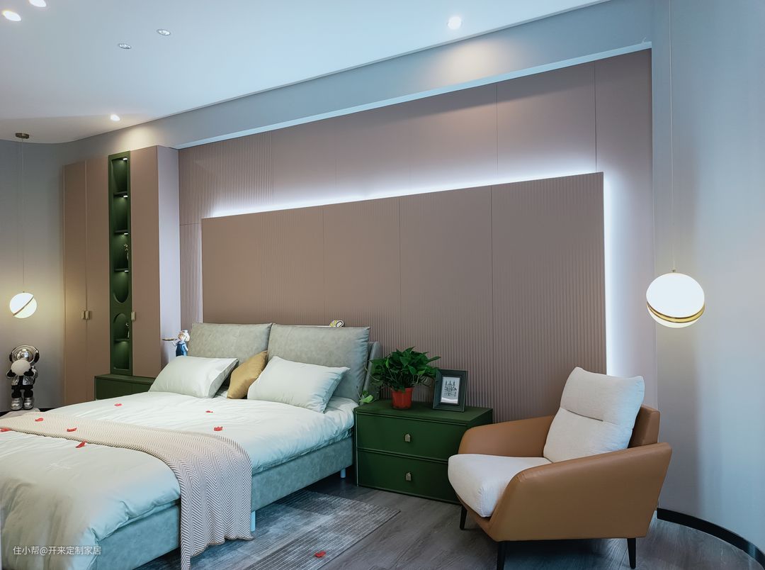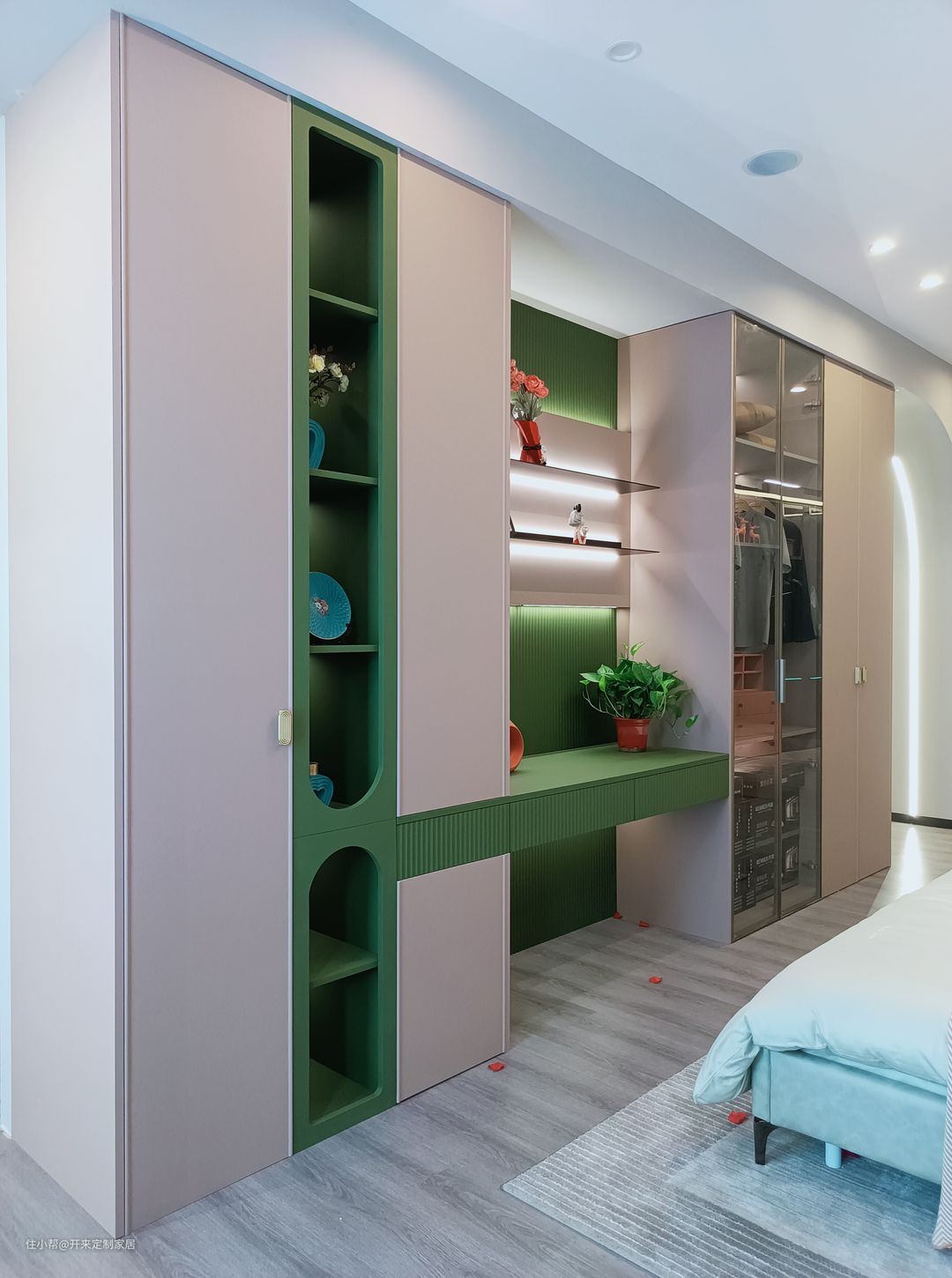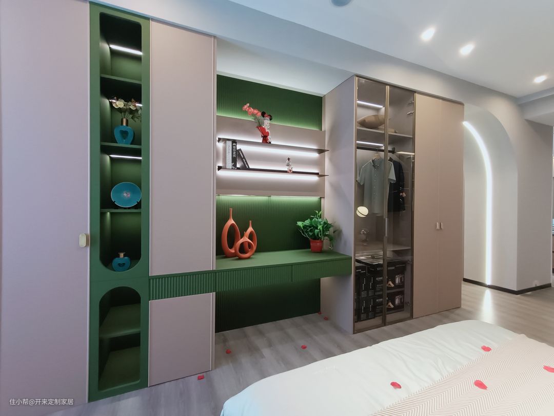 门型上采用简欧门型搭配黄铜拱形拉手,局部镂空透雕门型画龙点睛,配色上采用错色拼接设计,枯荷雅灰低饱和色中点缀素节竹青较为清新的色彩,使得卧室空间富有宁静与活力的双重张力。
