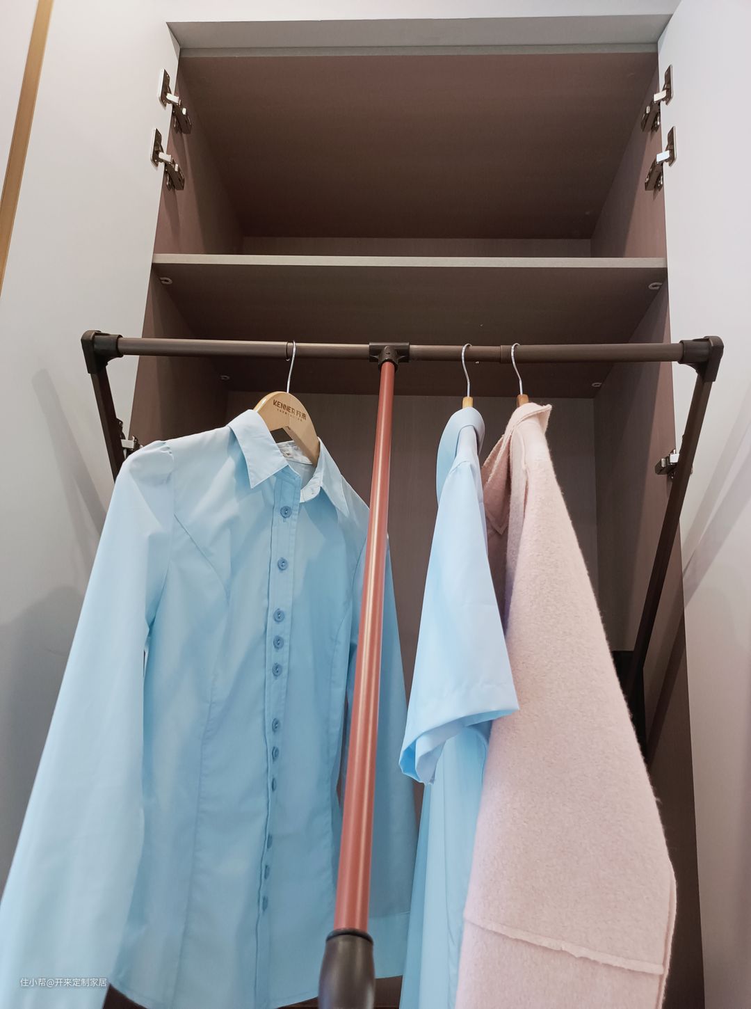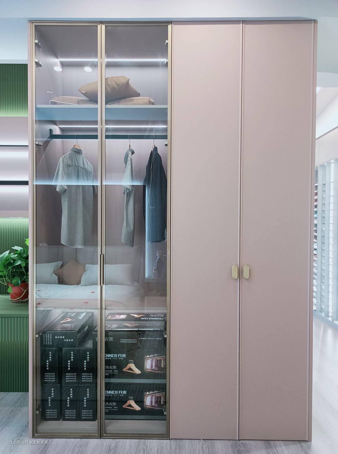 衣柜高柜与悬浮抽屉穿插式结合,打造出收纳区与梳妆区,一体设计更具整洁大方。实门柜内设计升降式挂衣杆还有旋转衣镜,玻璃柜内分挂放区叠放区等,金色窄边铝框玻璃门通透美观,精致十足;梳妆区设计格栅浮雕板,增设平板护墙打造出开架区,收纳梳妆用品装饰且实用,灯带增添美感。