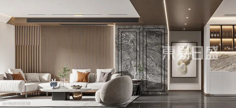 开放式公共区域,以灰咖色营造空间精致感,不同的材质表现和碰撞,和谐低调地表达着空间的沉稳静逸。背景墙以木色衬底,叠加白色石材装饰,嵌入开放格与电视,整体时尚大方,简洁开阔。