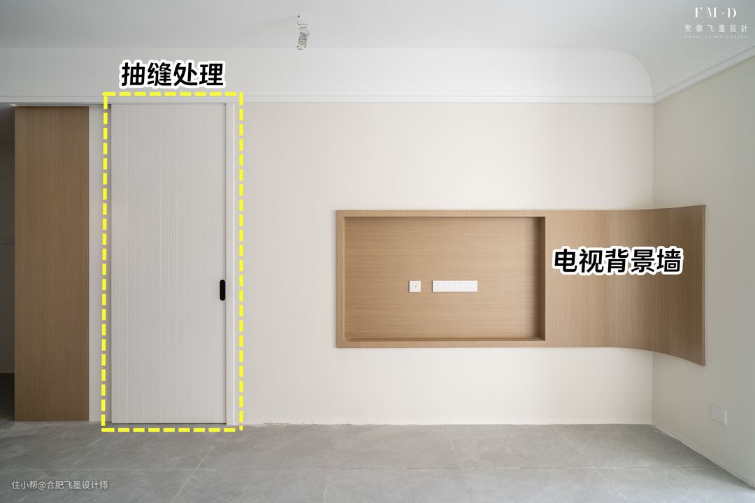 硬装差不多完工了,原木+白,全屋温馨又耐看!设计上也有不少亮点,以电视墙为例吧,卧室门就在旁边,这种户型痛点很常见,为了看上去更美观,灵机一动装面推拉门!如下图▼