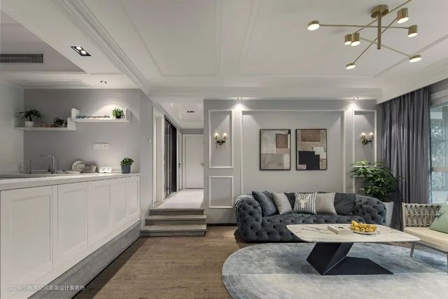 第一种设计方案是将横厅区域一分为二,一半作为客厅区,一半作为餐厅区,改造成客厅+餐厅的格局,为了更好地区分功能区,我们可以横厅中间摆放沙发作为隔断,将阳台的光线引入室内,营造一个明亮宽敞的空间。
