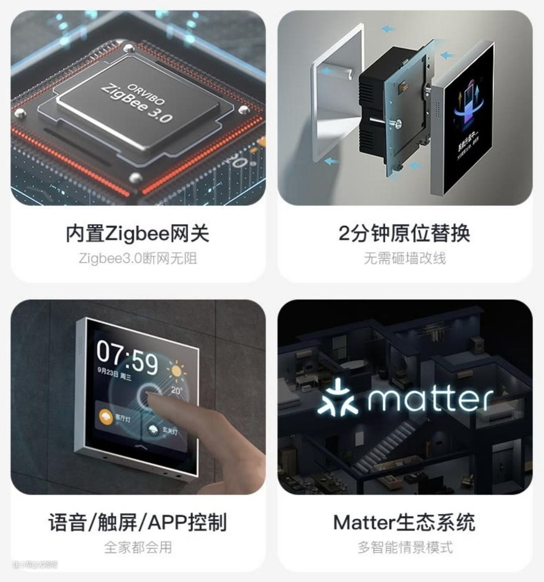 所以如果你如果预留了零火双线,其实我更推荐欧瑞博触屏智能开关,一个设备就可以同时替代智能开关、网关以及智能音响,并且还能作为中控屏幕使用。