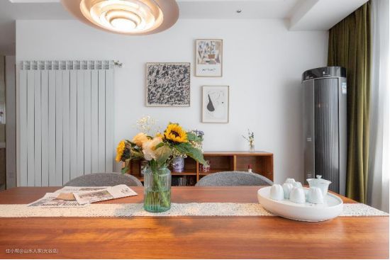 餐厅背景刷了一面白墙,并用几幅简约画点缀其中,平添一份自然的韵味。胡桃色餐边柜的选用,更好地满足实际储物的需求。在此基础上,还成为提亮空间、装饰墙面的存在。