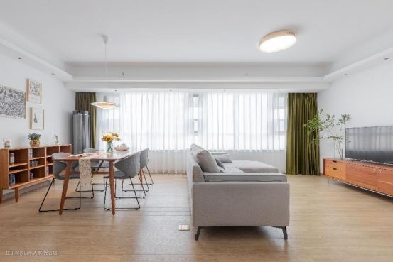 面对门后的超大空间,设计师则是做了开放式布局。将客厅、餐厅区域放在一起,相应提升了空间的利用率。整体采光视野优越,给人感觉非常地通透。