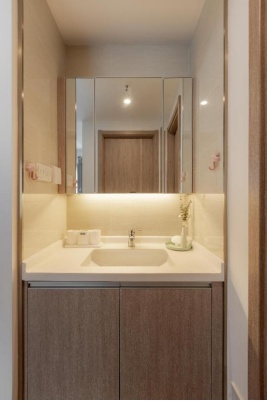 客卫通过将干区外置,有效实现卫生间的干湿分离。干区洗手池整体往内推,以此提供充足的操作环境。镜柜的应用,更是保障了一定的储物空间。内侧暗藏灯带,光线照明也很充足。