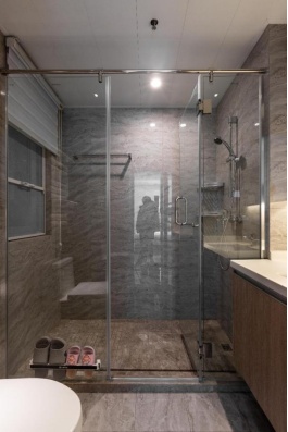 主卫通过安装玻璃门,有效将干湿区分隔开来。整间铺贴灰色瓷砖,冷色调的应用更是得心应手。一束柔光斜射进来,化作沉静的力量,让人静心沐浴。