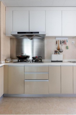 厨房整体空间比较开阔,橱柜整体布局呈L型。正面是炒菜区,白色吊柜+咖色底柜的组合,层次感更好。所有厨具归置整齐,做菜,也要赏心悦目,不是吗?