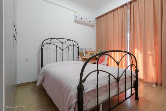 儿童房的布置则更为简练一些。一张黑色铁艺床,床头床尾都做了好看的造型。亮色窗帘的选用,给房间带来更多的生机活力。