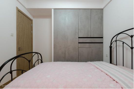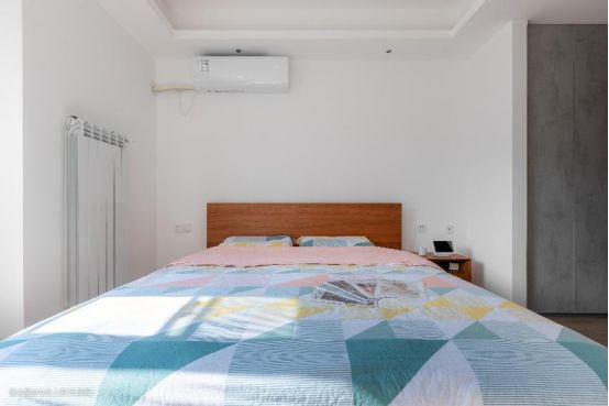 主卧的整体布局以简约素雅为主,尽显北欧风的格调。地面铺贴实木地板,伴着旭日骄阳,青春灵动的气息跃然纸上。高吊顶的设置,愈加充盈了室内空间,增加更多的生活层次感。