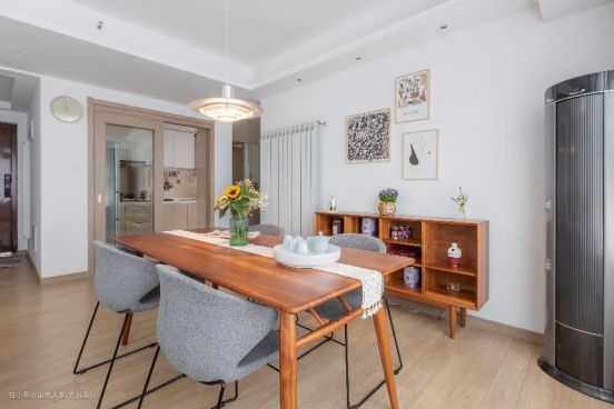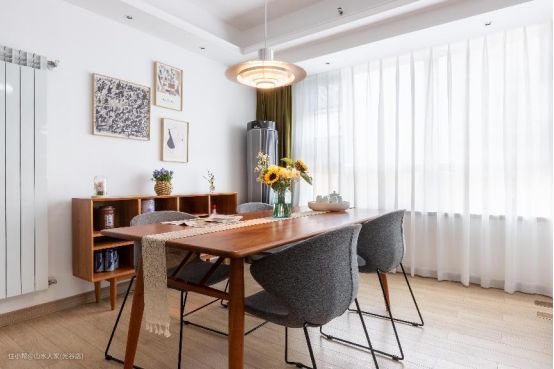 餐厅的整体布局比较简单随意。当初跟业主提到“客、餐厅放在一起”的想法,业主还质疑过会不会好看。事实证明,这样的设计格外地适配北欧风,大气有内涵。