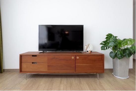 电视背景墙则是一面大白墙,剩下很多留白的空间。胡桃木色电视柜的选用,愈加丰富了整体视觉感受。旁边的绿植则进一步装点了空间,带来阵阵清凉。