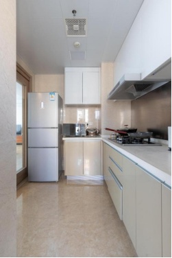 靠近门窗的小块区域,则是厨房里的茶水间。煮一杯咖啡,倒一碗清茶,这里都可以实现。冰箱就放在旁边,更好地利用到室内空间的空隙。