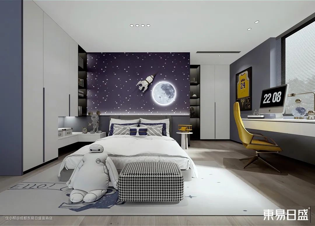 在可接触区域都做了圆角处理,安全陪伴孩子的左右。床头铺贴了一款卡通壁纸,丰富的图案显得既舒适又和谐,童趣味十足。