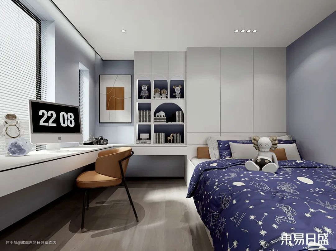 ② 设计师对二层进行了空间上的规划设计布局,将主卧,次卧,儿童房进行设计,使每个房间都有充足的储物空间以及舒适的居住体验。