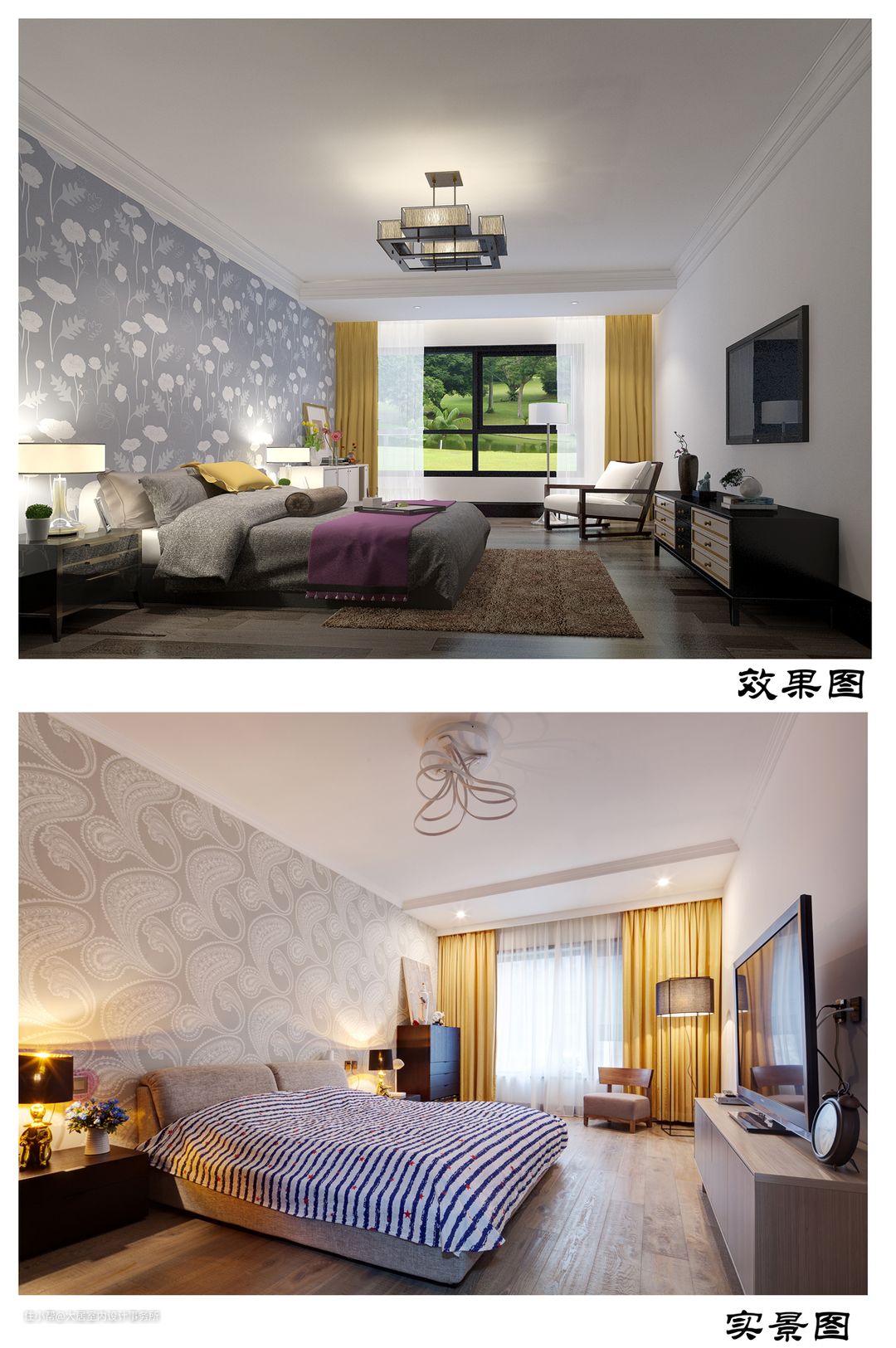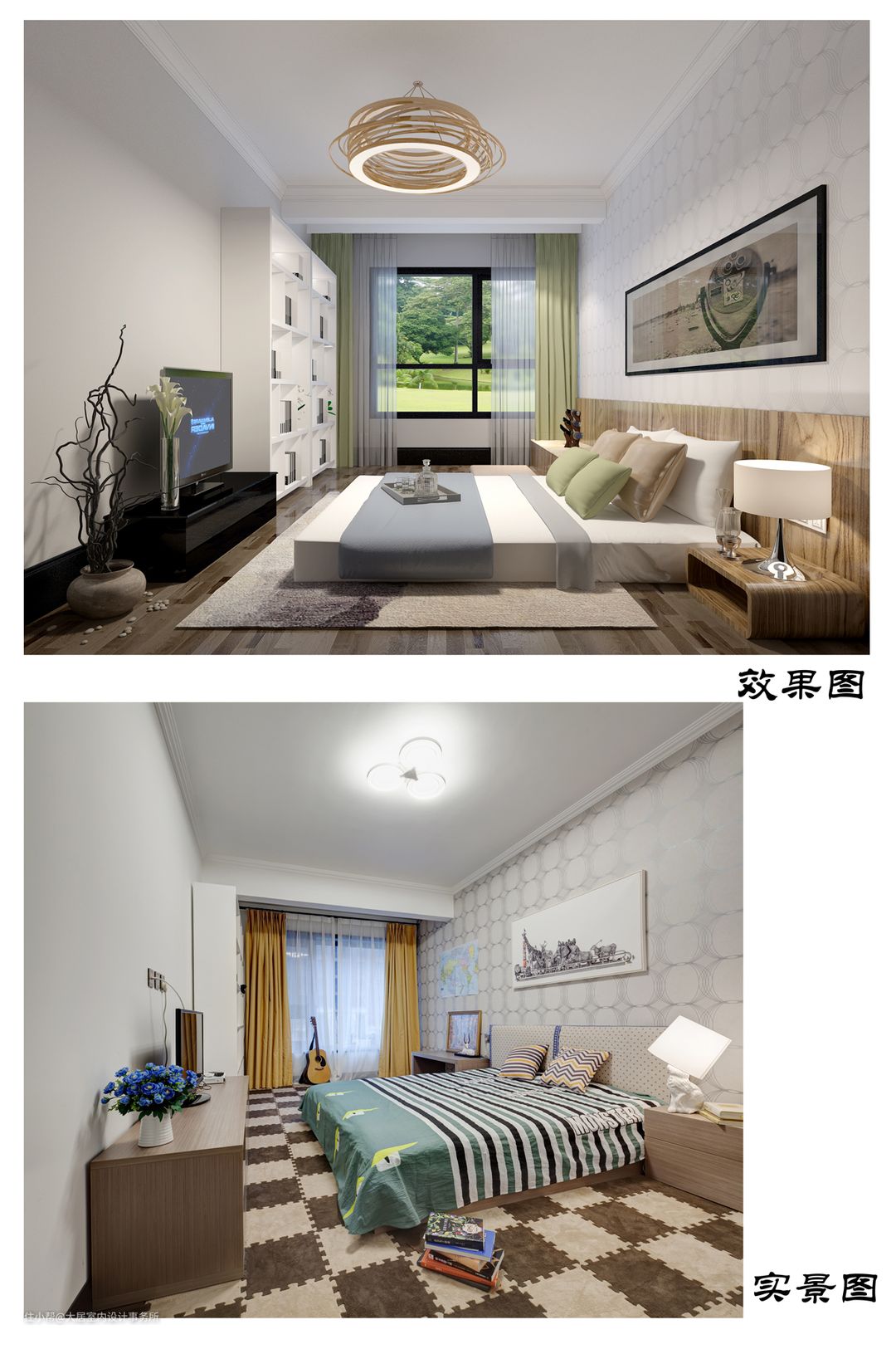 当我们看到效果图和实景图会有一定的差距。这是因为后期有些软装类的产品业主随着装修时间的改变而改变,起初我们所做的效果图和实景落地图完全可以达到95%以上的相似度,因为装修的工期比较长,在后期业主难免会选择一些比较心仪的产品。但是不难能够看到很多大框架的东西是无法改变的,改变的只是一些配饰和装饰。