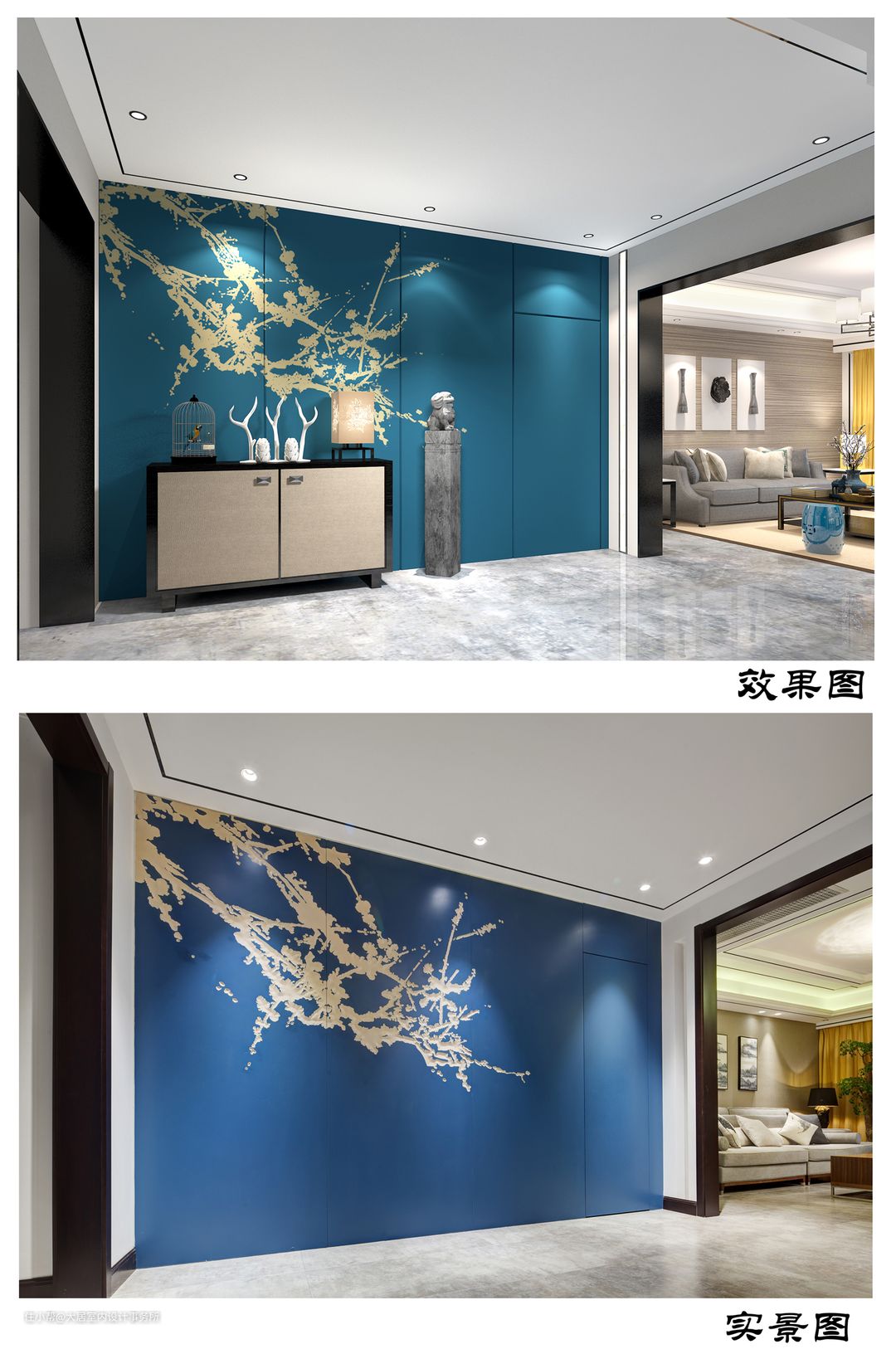 亮点就是我们的玄关处,这一处应该可以说是整套房屋的设计灵魂所在地,因为这堵墙,我们整体粉刷了一个墨蓝色,而且做出了腊梅的设计效果,当然在右侧有一樘隐形门可能如果我不说也很难被发现,这是一个隐形门。在这张图上我们可以清晰的看到实景图,其实比效果图还要出效果。包括整个吊顶,我们可以看到和效果图还原度也是非常高的。