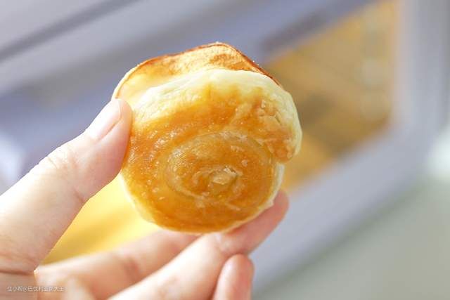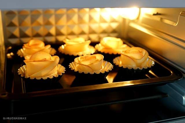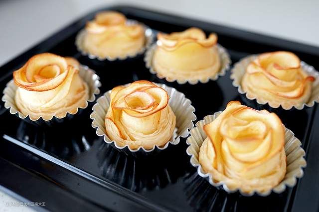 ►手抓饼底部包住苹果片,从一侧卷起,然后整理成玫瑰花的形状就OK啦~