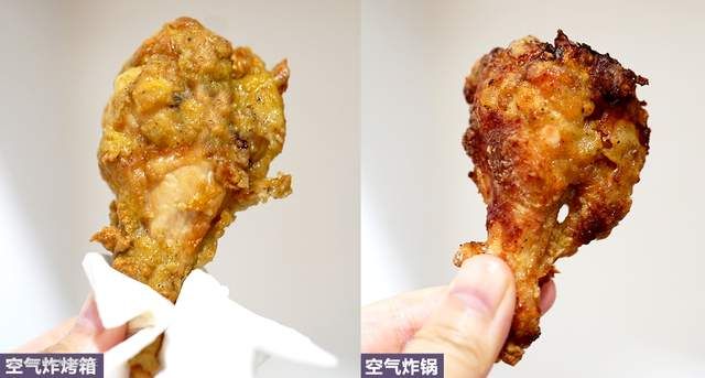 图中是我分别用空气炸烤箱和空气炸锅做的鸡腿,明显看出空气炸烤箱炸的更外酥里嫩一些。