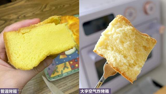 右边电子控温的空气炸烤箱做出的戚风蛋糕,蓬松度更高,完全没有出现焦糊、萎缩、夹生的现象。