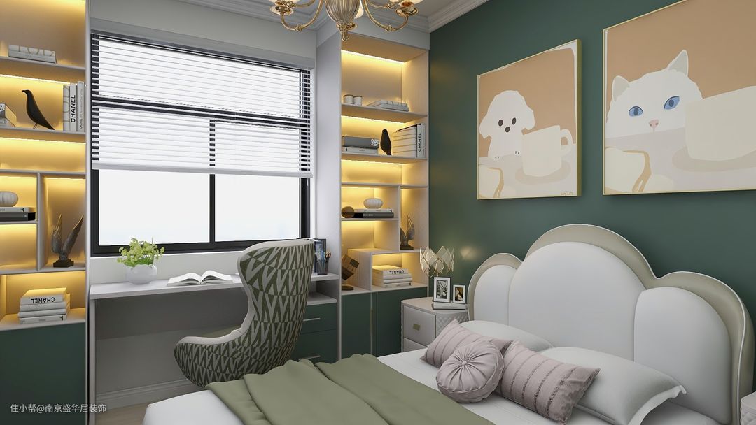 🍃次卧:次卧的整体空间以橄榄绿为主色调。沿窗打造书柜与书桌一体的书桌,以灯带进行点缀,加以家具的衬托,与主题相呼应。