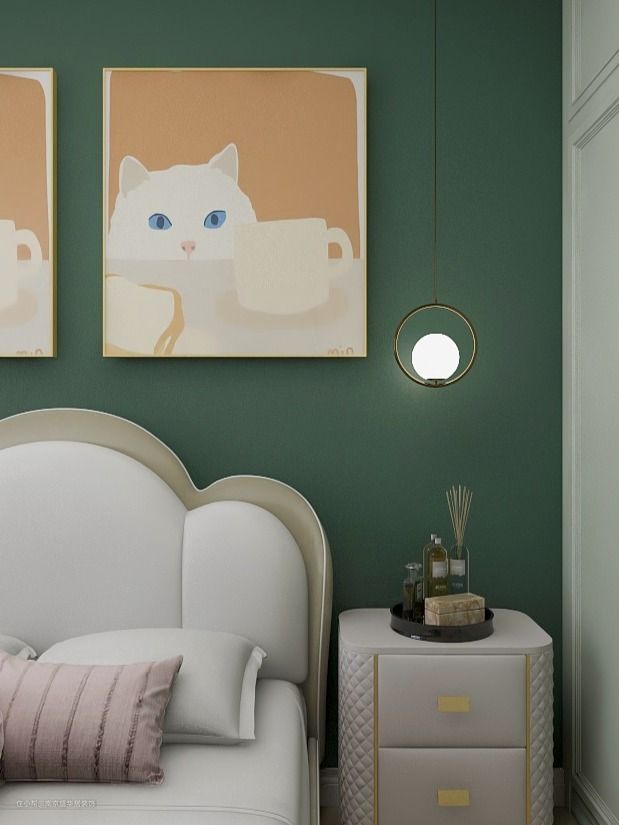 🍃主卧:作为主卧应更加的沉稳大气。故整体空间以清爽的浅绿色为主色调,让人一下释放所有的压力,再加上少许深色点缀,突出视觉层次感,同时也给空间增添些许生气与温度。将现代元素与传统法式融合,摒弃了原本繁复的雕花与装饰,优雅、乐趣和舒适的理念贯穿其中,流畅的线条和唯美的造型,在轻法式格调的低吟浅唱里,静诉时光的美好。