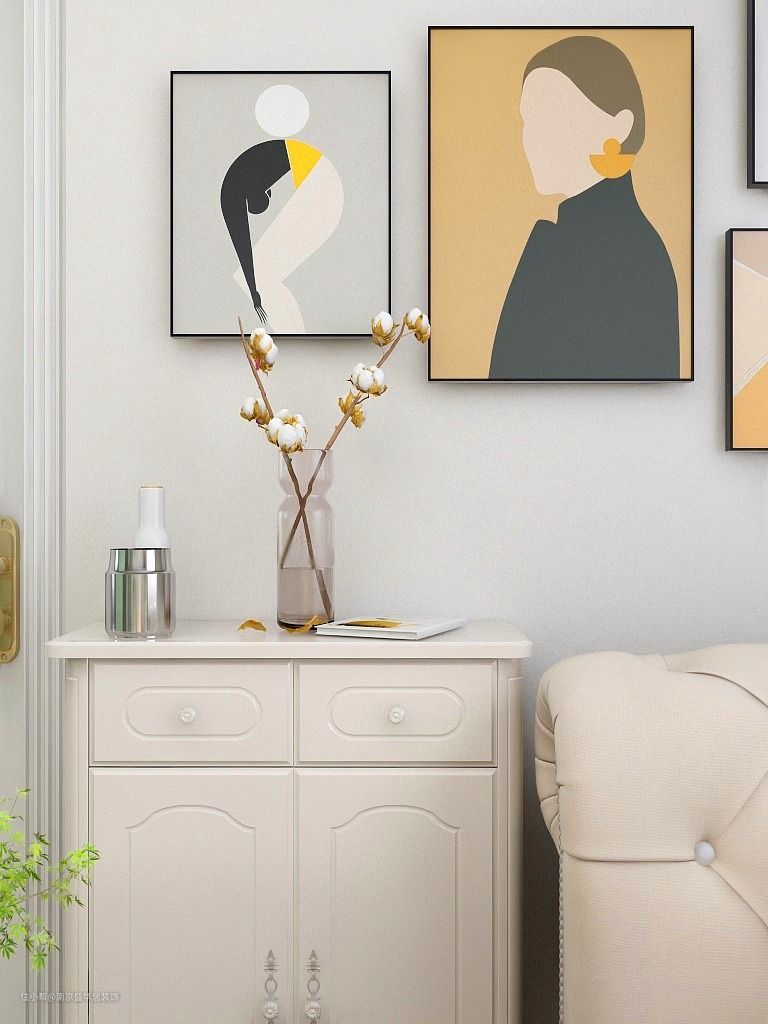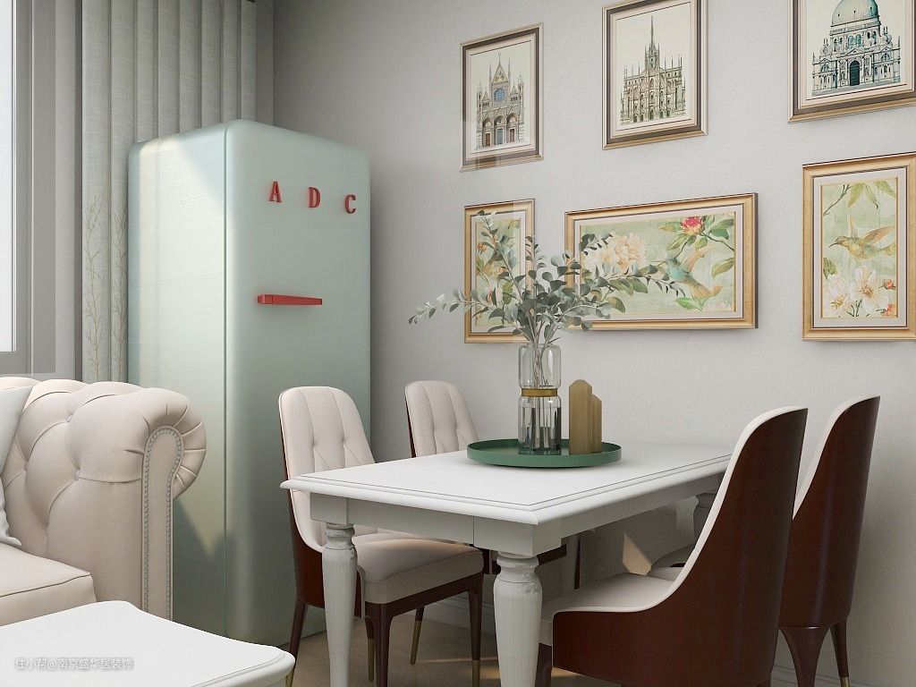 🍃客餐厅:在家具的采用上,采用具有独特风格体现的法式沙发以及茶几与主题相呼应,加以装饰画作为点缀。以浅色为主色调,用少许深色进行点缀,例如绿色和红色;在地板色彩的选用上使用原木色,在视觉上令人觉得较为柔和、舒适。整个空间的家具选择上以简约来突显品质感,选择更灵活的配饰,创造轻奢化的法式浪漫,强化主题风格的同时,意在提升空间的艺术感。