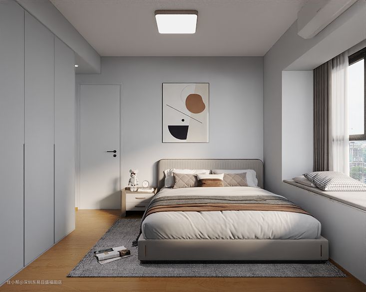 次卧:小朋友呆的地方,衣柜书桌满足正常需求,灰色的空间加蓝色背景墙的点缀,沉稳中透着孩儿童的可爱与天真。