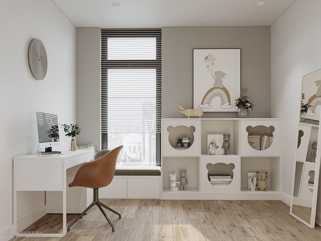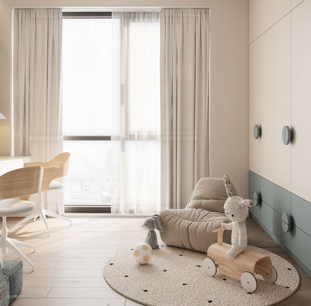 储物空间:相较于大人的卧室来说,孩子们的玩具、衣物、书本之类的东西反而更多,这时候就需要强有力的空间收纳来对这些物品进行分门别类的归拢,可以让孩子拿取方便,同时还能保持整个房间的整洁、干净。