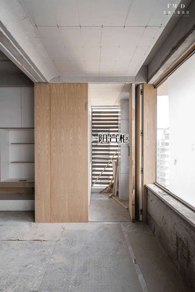 将空调机位空间加上阳台一侧空间,利用隐形门和护墙板组合,实现完全隔断,关上门,完全隐形,视觉上一点不碍事,平时也方便打扫。