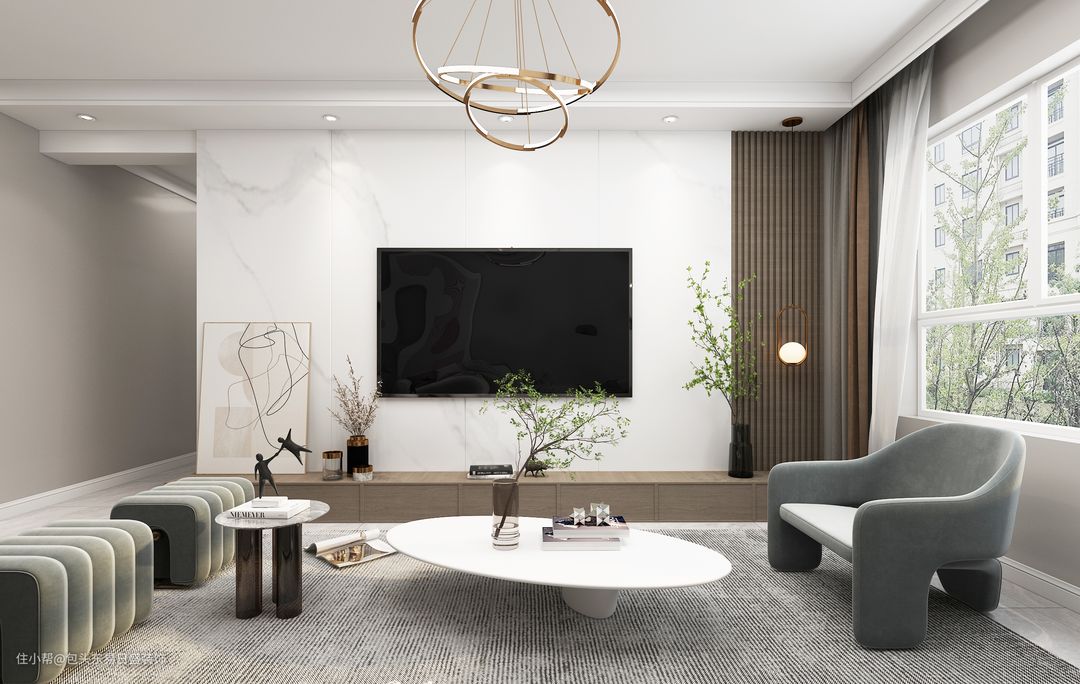 电视背景墙爵士白纹路护墙板搭配橡木格栅,经典大气。电视柜为定制柜体落地设计便于打扫,通边设计满足客厅杂物收纳。