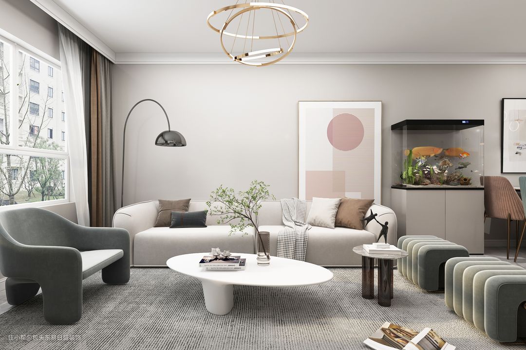 浅灰色沙发搭配莫兰迪绿色的单人沙发,高级舒适。背景墙简约设计,极简挂画搭配落地碗灯,层次分明。