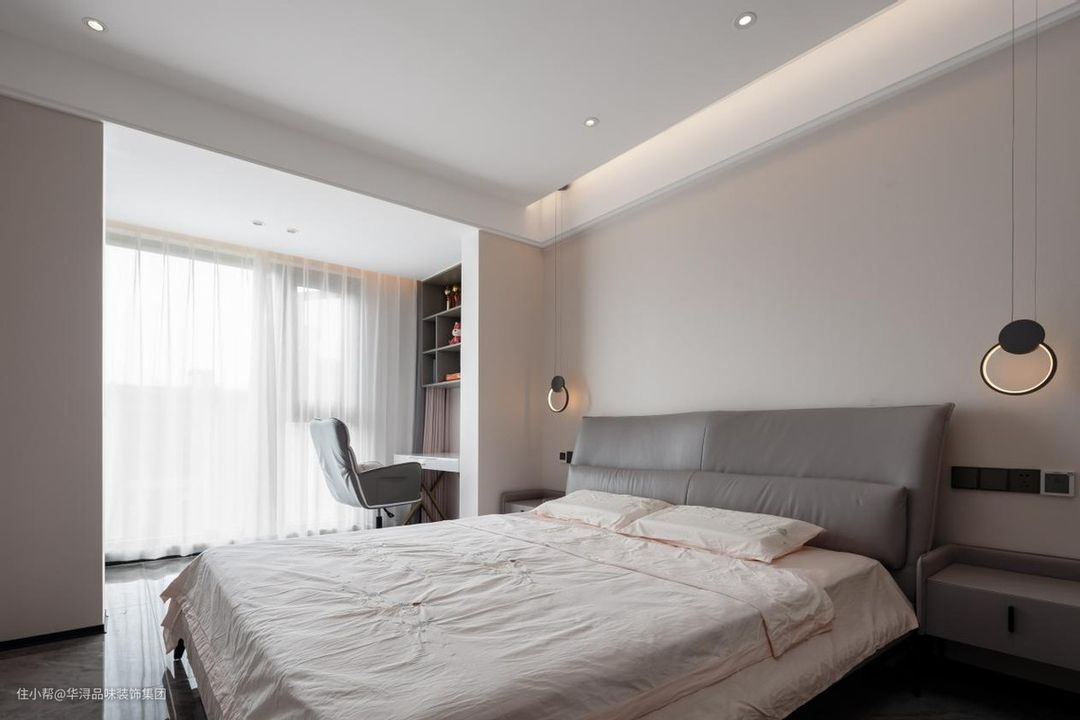 由于主要活动功能区的重色调的大量使用,导致整体的色彩深重不平衡,所以在主卧的设计上就采用了浅色的色调,白色的吊顶,浅灰色的墙面,看上去更显轻盈一些。