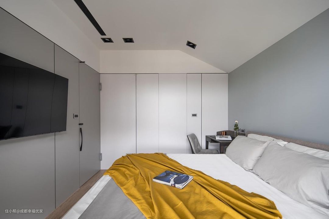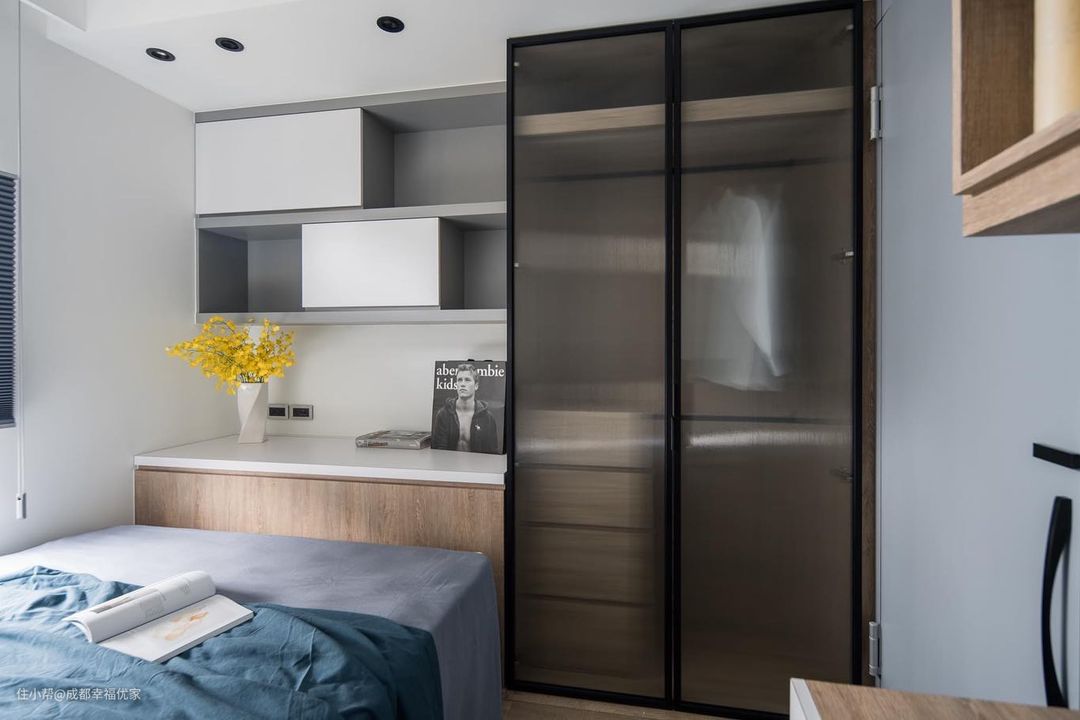 次卧空间比较小,只能从实用性出发,满足基本的居住需求。在床尾做定制衣柜和书桌设计,方便日常收纳储物。磨砂玻璃柜门搭配极窄黑框设计,简约却高级。在墙面做吊柜,开放式柜门设计,平时可以放置书籍,不浪费每一个角落。