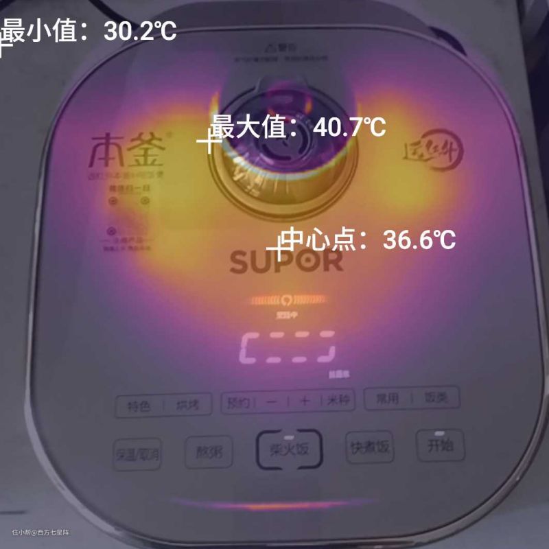 近期我从朋友手里借到了一台热成像仪,于是我在煮饭时特意用它来观察了一下加热过程,结果也是非常有趣。这是刚开始加热时拍下的,可以看到,顶盖远红外加热部位的温度要比内胆区域还高一点,但内胆区域的温度分布确实非常均匀,IH加热和远红外加热的优势都得到了很好展现。现在,我可以更有底气地回答标题中的提问了,那就是这款苏泊尔远红外电饭煲妥妥的物有所值,绝对不是什么智商税!