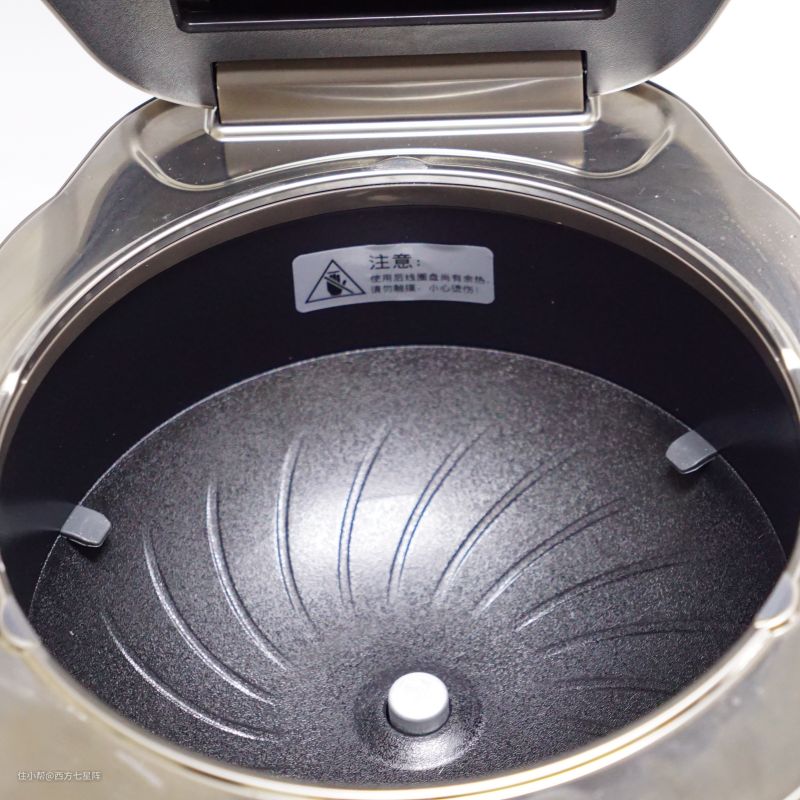 本釜内胆的下方,就是加热槽了,加热槽边缘有3个橡胶撑脚让釜体始终落在中心位置,加热槽内壁还有涂层防粘,非常便于清洁。