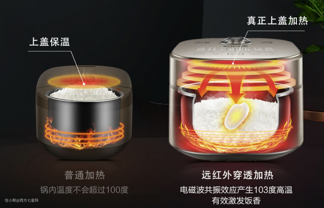 不过,IH加热并非终点,现在的电饭煲在IH加热的基础上更进一步,引入了远红外加热技术。这种技术利用远红外线的穿透和共振原理,产生超沸点高温,热量直接穿透至米饭本身,米芯自内而外加热,减少热传递过程中的损耗。