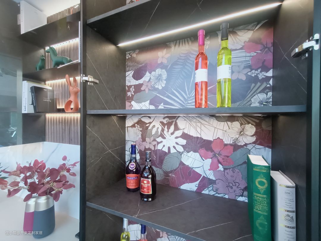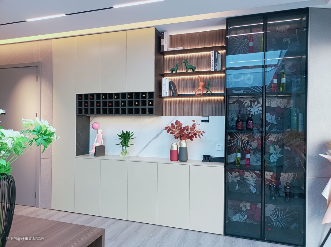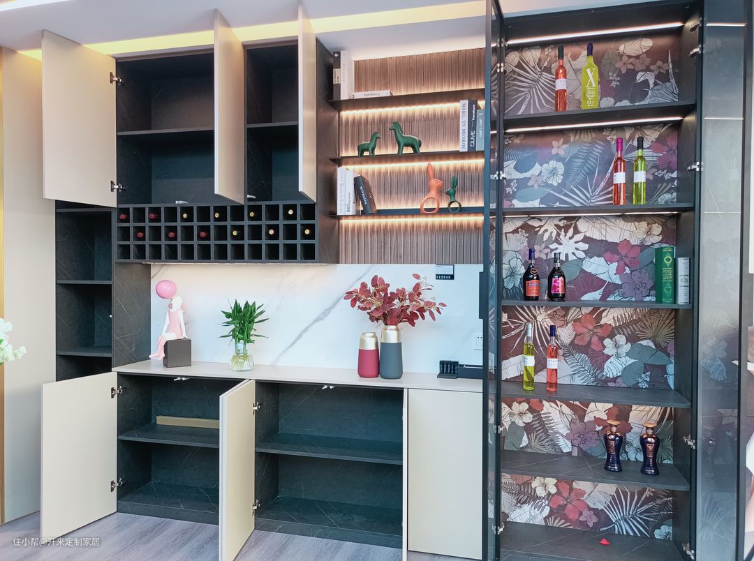 吊柜下方设计方形多孔开架,打造实用储酒区恰成装饰之美,封闭式实门区将吊柜、地柜通过一侧高柜相连一体,平板门搭配隐形内扣拉手线条流畅简洁。