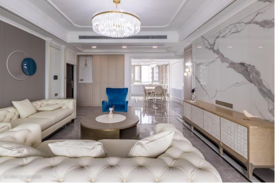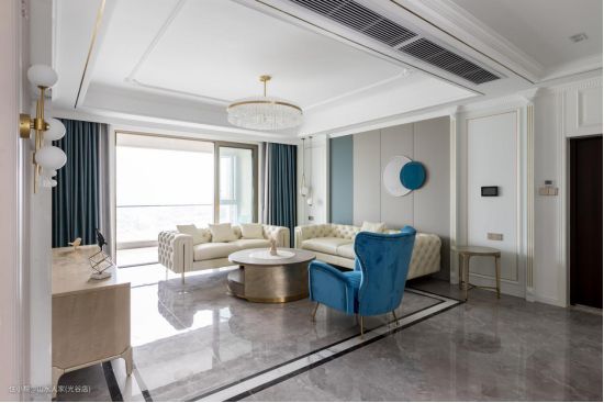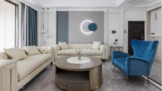 沙发背景墙用的浅灰色+深蓝色的硬包拼接跳色,上面还有着连环圆的造型,透露着华美精贵的气质。两侧还有金属线条的修饰,搭配长长悬挂的吊灯,凸出一份细腻与精致。纯白皮质沙发+深蓝色单人沙发的组合,拱围着泛着金光的圆几,显得庄重而虔诚。