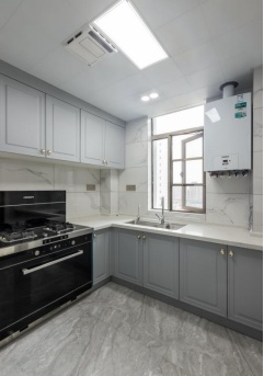 这是厨房里的烹饪区域。白色瓷面搭配浅灰色橱柜,凸显低调简洁的气质。顶部更是挂有一整排的浅灰色吊柜,极强满足业主储存生活用具的需求。