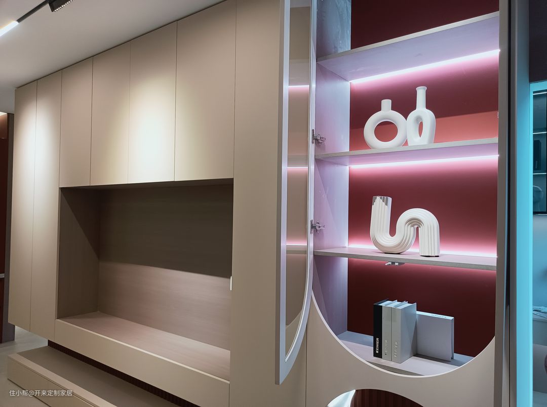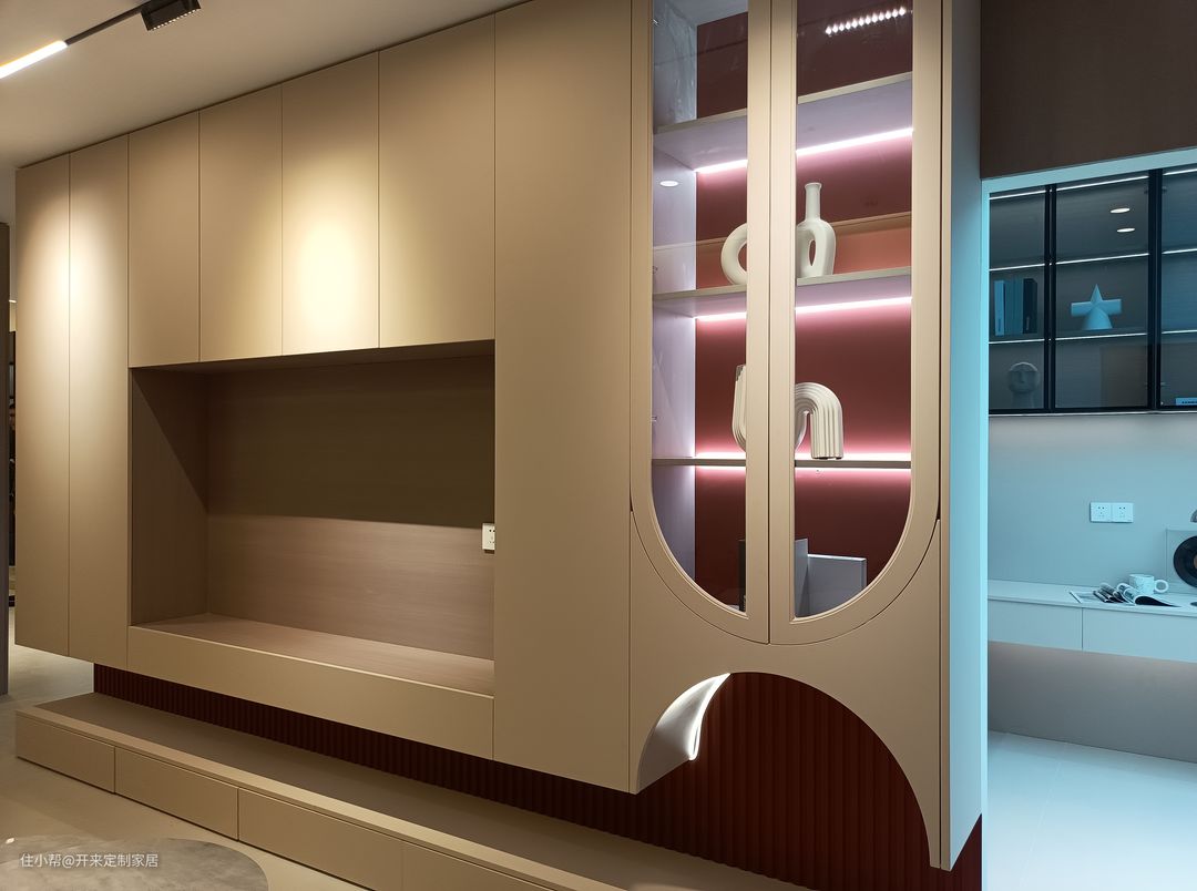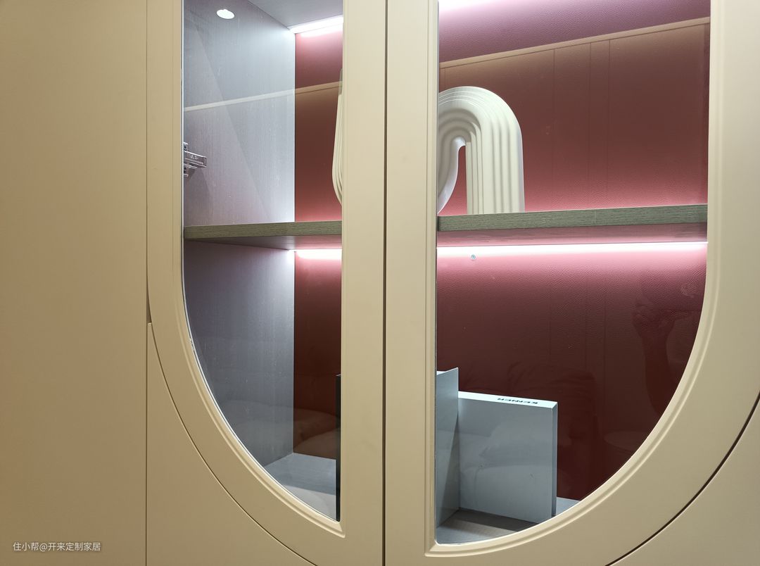玻璃柜透出内部的红棕色复古背景板,圆弧曲线勾勒出空间的欧式感。
